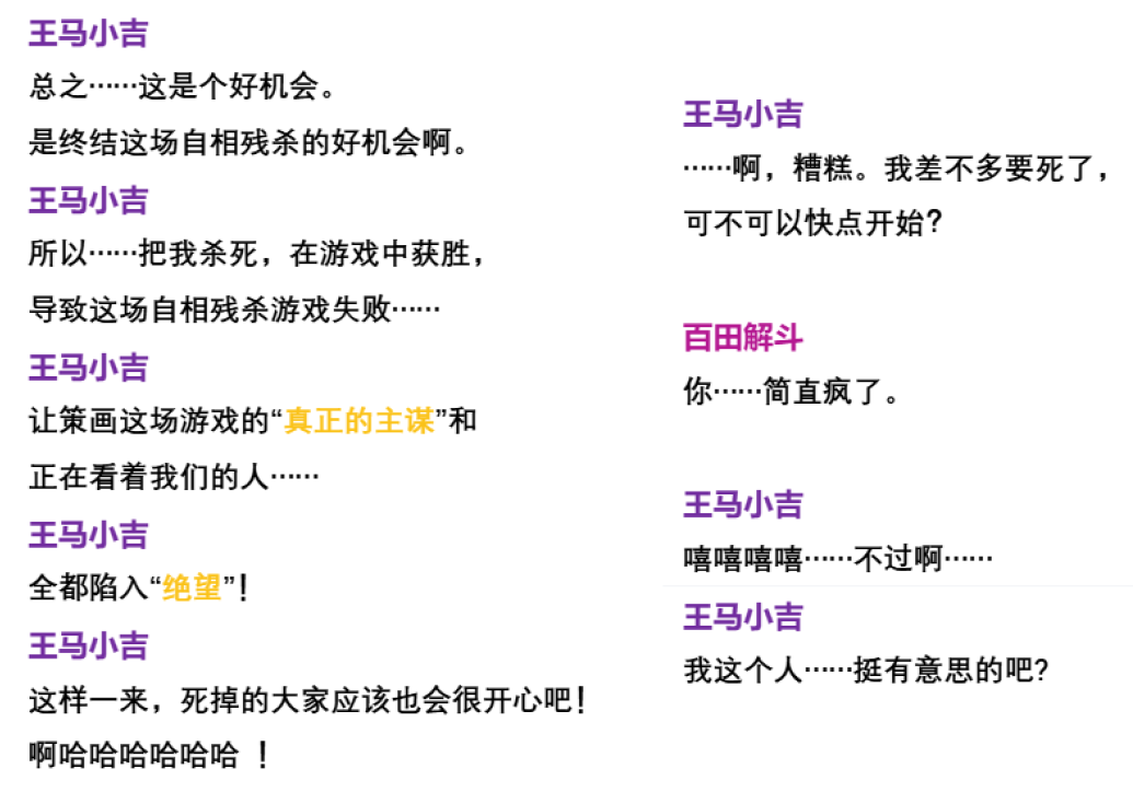 感觉小孩第四章开始的行动就一直是孤独的,这之前明明还会揭破梦野帮大家释放感情。居然冒着生命危险试图说服入间、但还是不得不让权太杀人……,感觉随着入间和权太的死或许他才彻底决定舍弃自己的生命也要赢这场游戏: