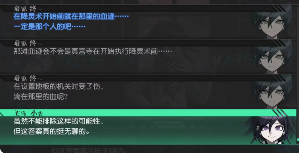 王马连【真宫寺自己不小心受伤】的可能都否决了,居然就只是因为【那样挺无聊的】,要最原得出【更合理的结论】。