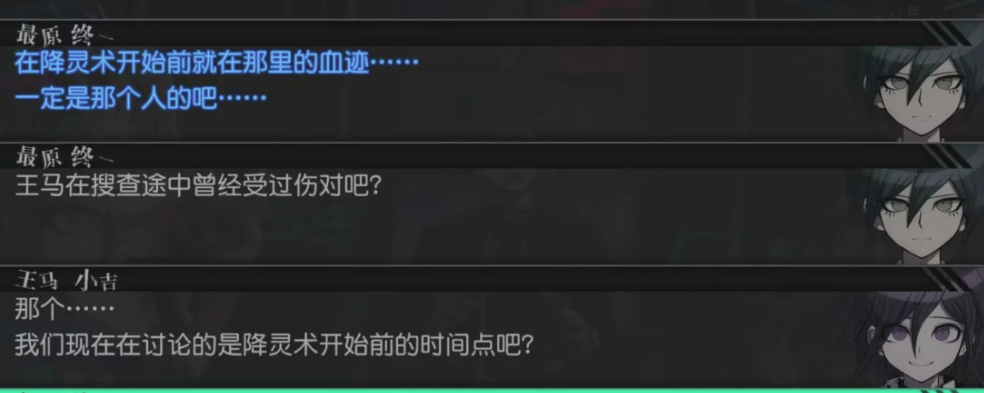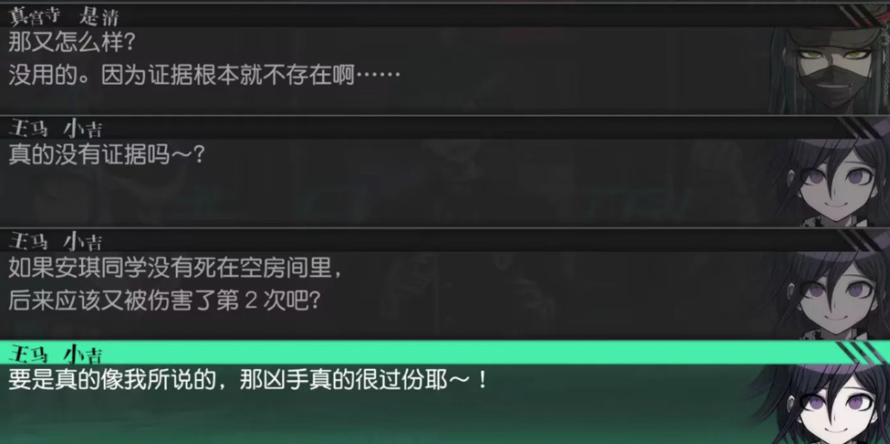 比如第三章刚拿到道具开始调查的时候,玩家很容易【直接就先开放紧挨着春川教室的四楼】,这样的话在比较远的走廊的王马的这段话就会被吞,变成下一段【好,马上出发去探险吧!】的兴奋发言