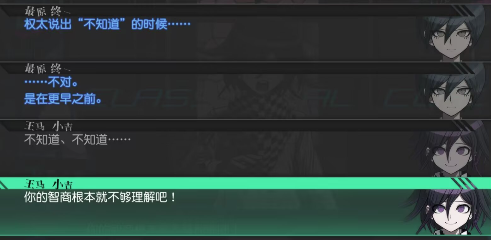 这么看来最原的智商水平可能在v3里其实是中上游(前面有真宫寺/王马/天海/星龙马足足四个),难怪是设定为预备侦探 如果是雾切来的话玩家就享受不了解密了……