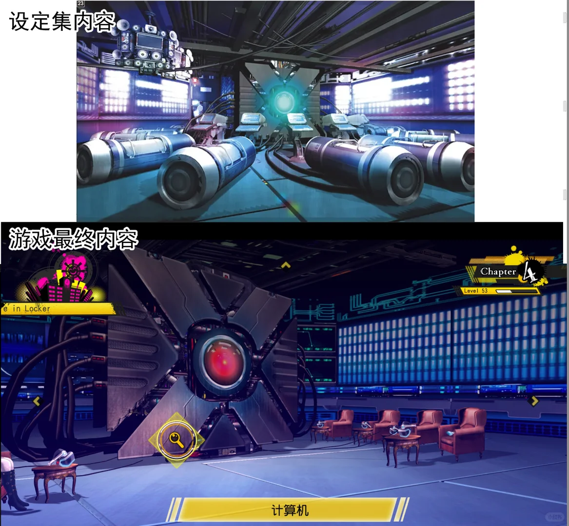设定集里电脑室有很多【胶囊状的物品】,实机没有,显然变成了废案。