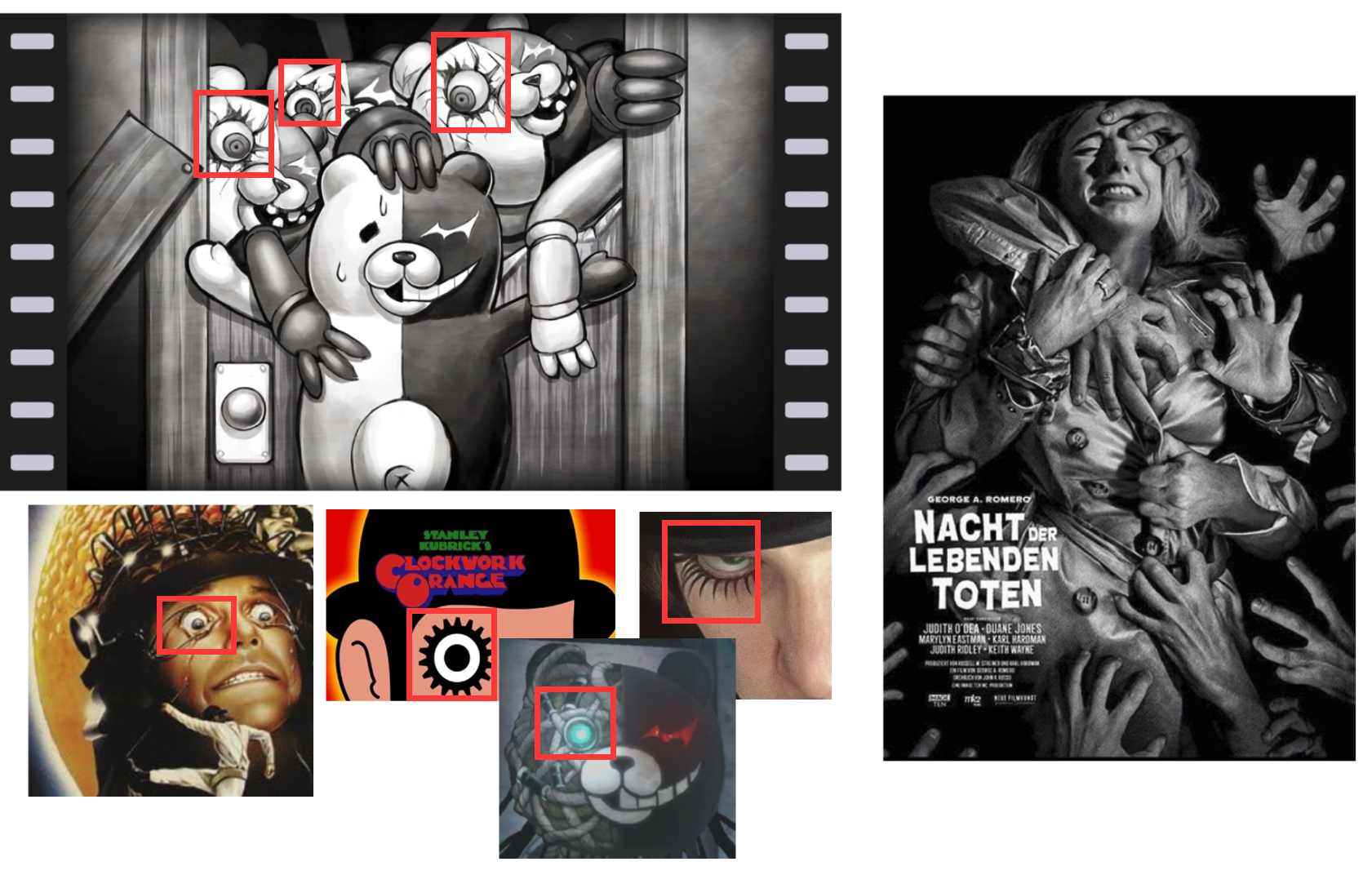 ——但cg却使用了非常明确的【左眼凸出】、延伸像【发条橙男主作恶期左眼妆造】的【裂缝】。而黑白熊之母也是【左半侧的脸部剥离】。