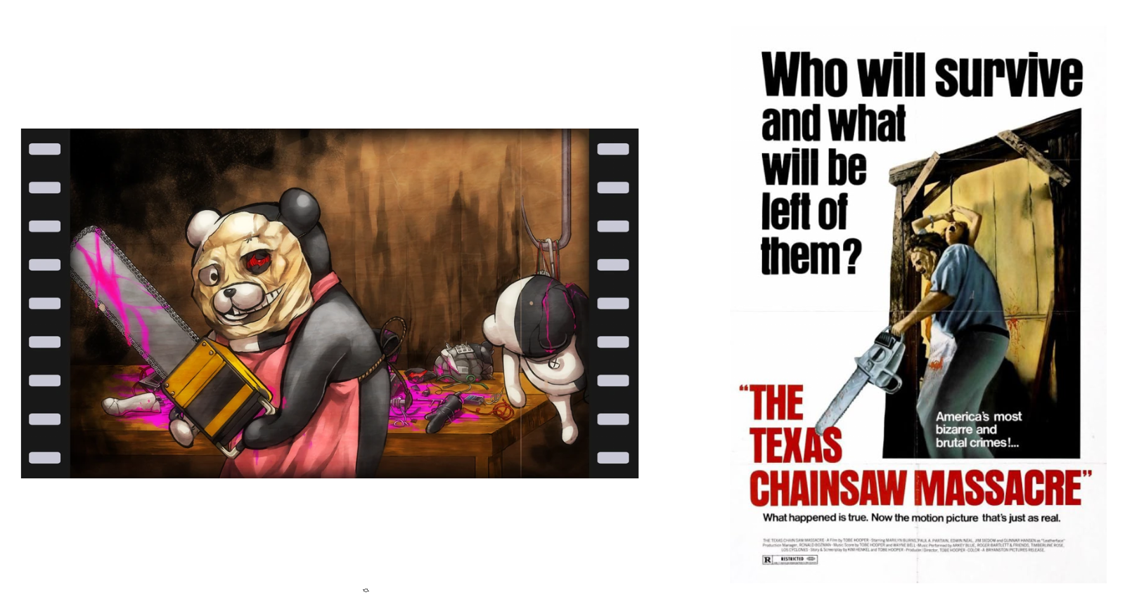 这张CG表现了【吊起受害熊的钩子、已经被分尸的另一只熊】,这对应电影中一人被抓住以肉钩刺穿后、被迫目睹电锯屠宰同伴的场面。